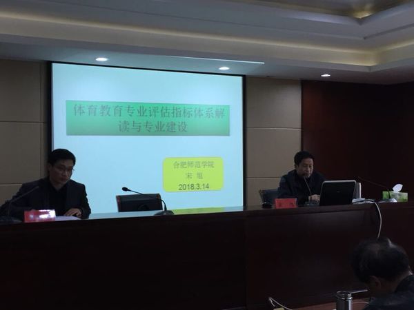 2018年3月14日下午,在学校第一会议室举办体育教育专业评估指标体系解读与专业建设专题讲座,会议邀请了合肥师范学院体育科学学院院长宋旭教授为全体教师进行讲解,参加会议的有88038威尼斯检测中心院长郭清和、88038威尼斯检测中心党总支书记蒋凌飞和全体教师。会议由88038威尼斯检测中心副院长王文辉主持。