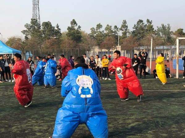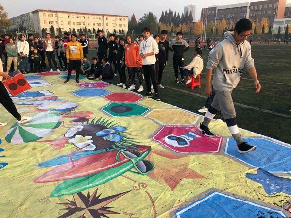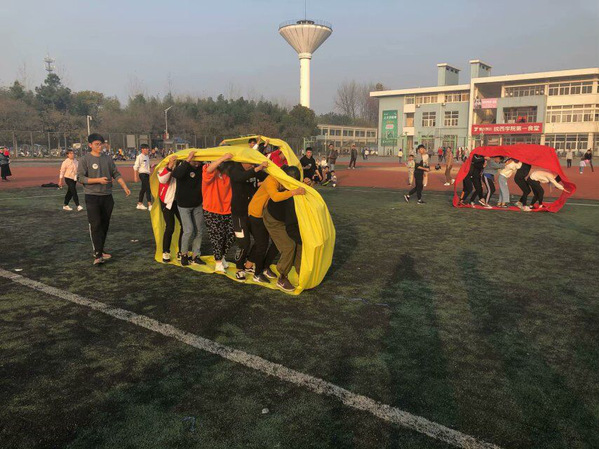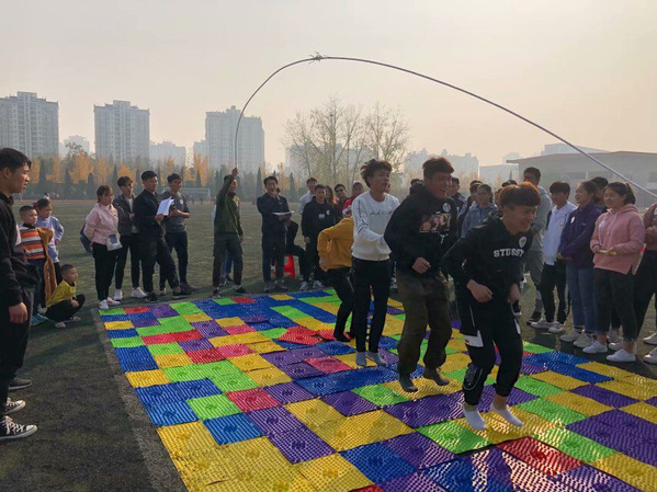 本次团建活动开展的游戏项目有四个,分别是“趾压板跳绳”“撕名牌”“坦克履带”“飞行棋”。活动在学生会主席刘和伟的主持下开始,主席团其他成员则负责现场裁判及掌控工作,大家在操场上尽情追逐,互相配合,充满了欢快的气氛。