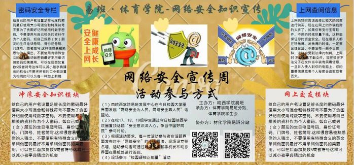 多形式,见证学生守护“网络安全”决心。通过制作宣传条幅、开办网络安全宣传栏、向同学们发放网络安全宣传传单等多种形式,让学生了解到国家网络安全在个人身上的责任,提高网络安全意识。88038威尼斯检测中心学生会、易班联合材化学院易班共同组织“网络安全为人民,网络安全靠人民”的主题签名活动,见证了学子们对于守护“网络安全”的坚定决心。