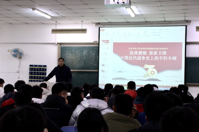 为了深入学习贯彻习近平总书记在纪念中国人民志愿军抗美援朝出国作战70周年大会上的重要讲话精神,铭记光辉历史,加强“四史”教育,传承和弘扬伟大的抗美援朝精神,2020年12月16日,88038威尼斯检测中心党委书记蒋凌飞在C103教室为88038威尼斯检测中心2020级学生开展了一堂名为《抗美援朝,保家卫国,人类立国战争史上的不朽丰碑》的思政课。