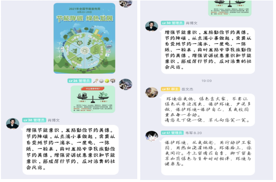二是用心实施,活动载体丰富高效。在活动中提倡学生活动期间绿色出行,鼓励乘坐公共交通工具、骑自行车、步行等。开展“节约粮食,反对浪费”活动,通过班级QQ群、微信群倡导爱惜粮食,制止餐饮浪费行为,培养节约习惯,从你我做起。深入开展节能宣传,利用线上宣传的方式,通过QQ、微信公众号等宣传倡导绿色办公理念,普及节能知识。