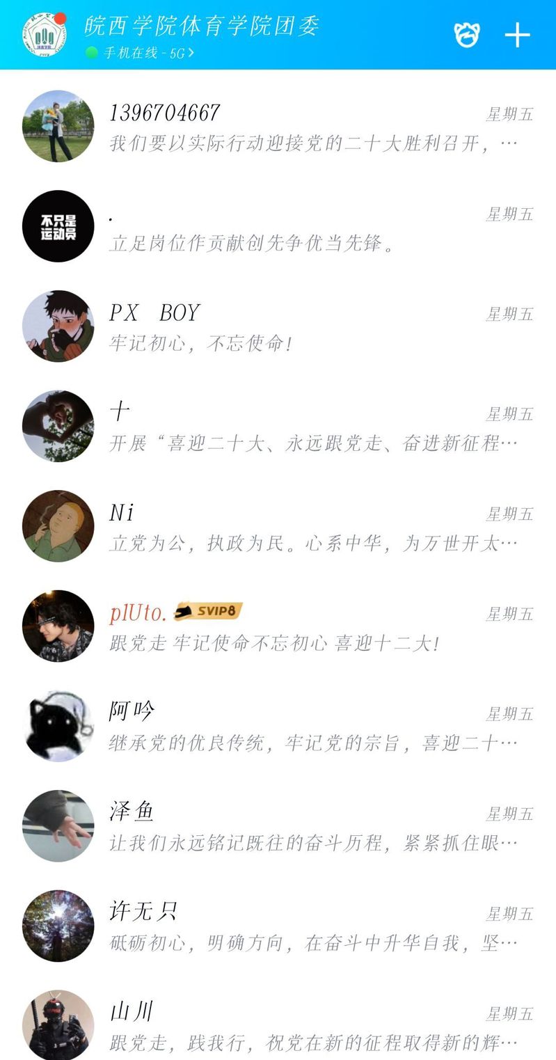 本次活动围绕“喜迎二十大、永远跟党走、奋进新征程”为主题,通过党史学习、红色观影等方式来打破常规,形成了鲜明特色,体现了各团支部的灵活性与创造性,也提高了活动的参与度,形成了良好宣传效果。活动期间,各团支部组织了丰富多样的活动,极大地调动了同学们的积极性。体育教育20级团支部书记杨帮顺以红色观影的方式带领同学们重温了中国共产党的光辉历程,并向大家讲解了自共产党诞生以来中国发生的巨大变化,让大家感受到了革命的艰辛、和平的可贵以及幸福生活的来之不易。体育教育19级学生也积极参加了“喜迎二十大、永远跟党走、奋进新征程”这一主题之下的书法、朗诵和微视频等各种形式的文艺活动,收到作品共计200余份,作品大多以党的光辉历史与伟大成就为呈现内容。同时,还通过线上、线下相结合的方式带领同学们观看红色影片“长津湖”,观看过程中同学们思绪万千,结合自己的实际情况踊跃发言,纷纷表示要为祖国的发展做出一份贡献,把真正的爱国之志变成报国之行。