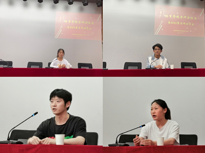 会议开始由2022届考研录取的学生代表分别结合自己的考研经历,详细地给同学们讲解了读研的必要性和在备考期间应注意的问题。包括考研各科的复习方法、信心的树立、作息时间安排以及如何选择专业方向和复试等方面的一些经验与心得。在听取考研交流分享后,潘声东代表88038威尼斯检测中心党委对2022届25名考研成功上岸的学子取得的优异成绩给予了肯定和祝贺,并鼓励2023届同学们积极备考,树立信心,发扬体育人不怕苦不怕累的精神,紧随师兄师姐们的步伐努力拼搏、奋勇前进,在2023年考研中再创佳绩;并对此次交流会的成功举办表示祝贺。