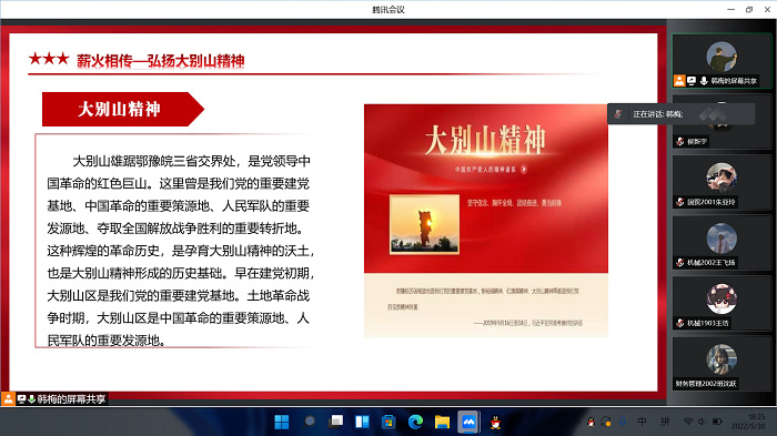 韩梅首先就“我们青年学子如何传承红色基因,争做新时代好青年”这一话题与学员展开讨论,她分别从立夏节起义、张家店大捷这两个故事进行一一讲解,故事中,革命战士们为了国家民族的未来抛头颅、洒热血,他们气壮山河、感天动地的英勇事迹,让与会人员重温了党在革命奋斗过程中的艰辛和不易,深刻领悟了伟大建党精神的丰富内涵,引发现场青年学子的强烈共鸣。随后,她带领学员们观看《大别山精神》记录片,对大别山精神的丰厚内涵和重要意义,进行多角度、多层面的讲解,让红色精神照进现实,实现历史与现实的汇聚碰撞,具有很强的思想性、理论性和实践性,对学员们传承和弘扬大别山精神具有重要的指导作用。