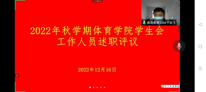 为贯彻落实《关于推动高校学生会(研究生会)深化改革的若干意见》(中青联发〔2019〕9号)有关要求,进一步加强对学生会组织工作人员的监督和管理,全面准确地掌握学生干部的工作情况,提高学生干部的责任意识、服务意识和大局意识。88038威尼斯检测中心于12月16日以线上会议的形式开展学生会工作人员述职评议会。88038威尼斯检测中心党委书记蒋凌飞、团委书记张讯豪、专职辅导员黄兴洋、张涛、李丹丹、黄云逸以及学生会主席团成员、各部门部长和20余名学生代表参加了此次述职评议会。会议由张讯豪主持。