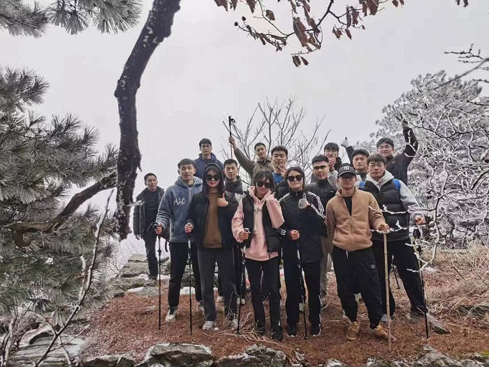 第三站是金寨县大湾村,同学们主要实习内容是休闲体育活动组织策划、户外运动指导与管理、体育旅游推广与经营和创新创业等,重点是红色活动和线路设计,结合课程思政教育,同学们重走红色路线,在林海雪原中艰难徒步8个小时登上大湾村的冒顶山,这里也是大别山最后一片被解放的土地。同学们在带队老师和向导的带领下,在冰天雪地里用汗水和艰辛为地方旅游企业设计出一条红色简装徒步1天的攀登线路,也为服务地方体育旅游产业发展贡献了一份力量,重点培养学生利用地方红色和自然资源开展休闲体育活动能力,雪天登山运动指导与管理能力,红色体育旅游线路设计能力和创新创业能力等。