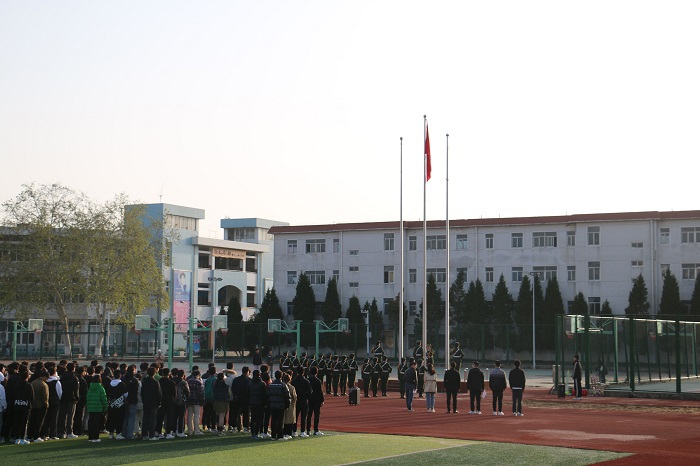 伴随着嘹亮的口号,国旗护卫队踢着正步护送着国旗庄严入场,在激昂雄壮的国歌中,全体师生庄严肃立,齐唱国歌,行注目礼,目送国旗徐徐升起。升旗仪式结束后,潘声东首先在国旗下致词,他指出,作为当代青年大学生,要心怀梦想、脚踏实地,以昂扬向上的姿态学习贯彻落实党的二十大精神,在民族复兴的新征程上续写新的壮丽篇章。并对全体学生提出几点期望:一、要树立大局观念,将“小我”融入“大我”;二、笃定成才之志,从“起点”看“变化”;三、走好奋斗之路,先“正己”然后“成人”;随后,学生代表何莹莹上台发言,她号召全体同学要认真学习、深刻理解新时代好青年标准,始终牢记习近平总书记嘱托,努力加强自身修养,自觉团结凝聚在党的周围,肩负起新时代青年的历史使命和时代责任。
