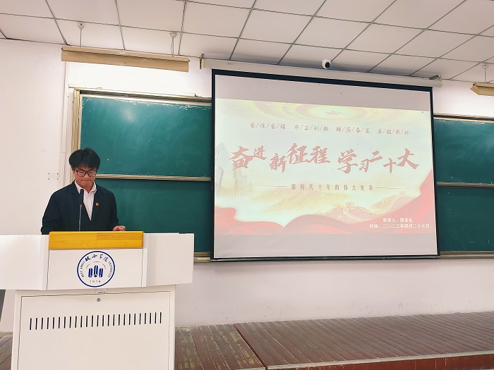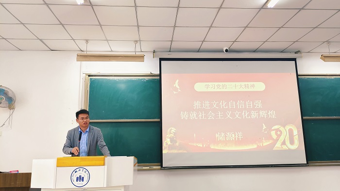 培训会开始,储源祥向全体学员介绍了本次培训授课计划及要求。他强调要深入学习贯彻习近平新时代中国特色社会主义思想,进一步加强入党积极分子和团学干部的马克思主义理想信念,激励大家不断推进文化自信自强,铸就社会主义文化新辉煌。民族的复兴离不开文化的繁荣昌盛,文化的自信自强与中华民族强起来的历程同频共振。自信自强就是向铸就社会主义文化新辉煌的高度奋进发展。而推进文化自信自强,不仅仅局限于文化建设,在二十大报告的各个领域都有鲜明的体现。希望大家要从一个更高的层面来认识文化,理解文化,把握文化,只有这样才能真正做到文化的自信自强,进而铸就社会主义文化新辉煌。储源祥说完后,周多礼表示在学习二十大精神时,当代青年要学会自信自强、守正创新、踔厉奋发、勇毅前行,才可以更好的奋进新征程。