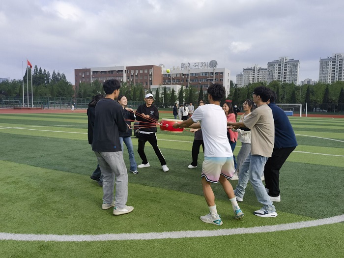 首先热身环节有“教练说”、“桃花朵朵开”等开团小游戏,人员分成3个小队,第一个项目是“鼓动人心”。各队刚开始没有掌握技巧,颠球数量少,熟练配合后颠球数量增加。经过练习,有一个队颠球数量高达几十个,让大家领悟到团结就是力量。紧接着进行的是“不倒森林”游戏,这是年轻人较为喜爱的娱乐项目,获胜的关键在于团队合作。