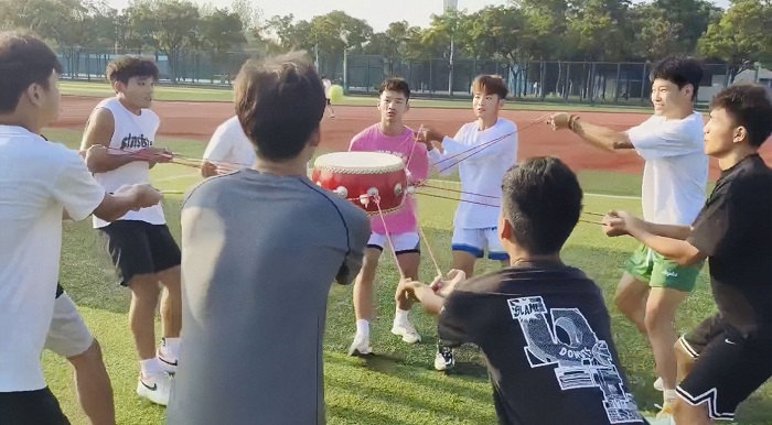 然后,新生们进行了一场精彩的“鼓动人心”比赛。大家分成了几个小组,每个小组都充满了斗志和团队合作的精神。在刘乃宝的指导下,大家紧密配合,用尽全力。这场比赛不仅锻炼了大家的力量和耐力,更重要的是培养了大家的团队合作意识和集体荣誉感。