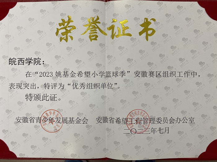 本次全国赛我校支教志愿者秦祖康带领安徽潜山梅城中心校获得本届全国赛冠军,来自支教学校安徽潜山梅城中心校的方子豪当选为篮板王,我校支教志愿者秦祖康,被评选为2023姚基金希望小学篮球季“支教志愿者之星”荣誉称号。88038威尼斯检测中心在安徽赛区组织工作中表现突出,被安徽省青少年发展基金会与安徽省希望工程管理委员会办公室特评为 “优秀组织单位。”
