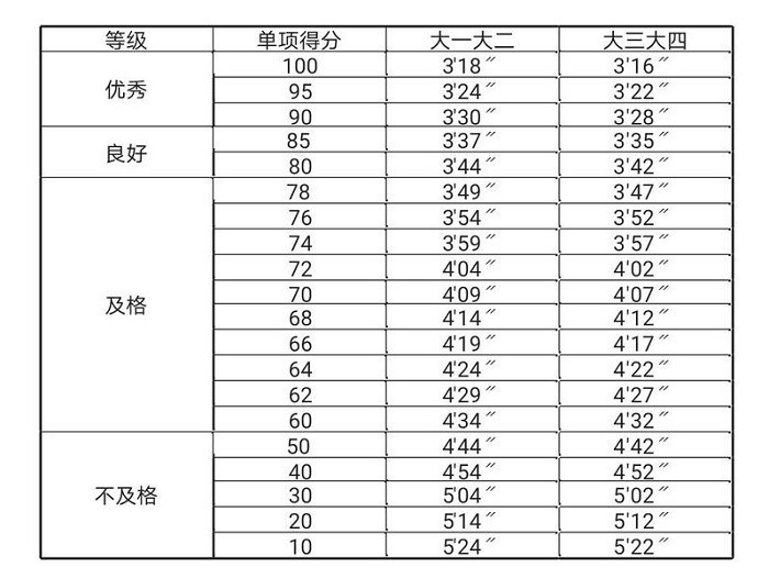 1.考试内容:(1)男子1000m、女子800m(评分标准详见表1、表2)。