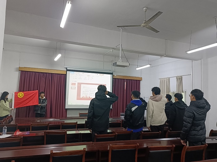 首先,张涛介绍入团的意义并宣读新团员名单,同时代表学院团委向新团员的加入表示热烈的祝贺和真挚的欢迎。入团仪式在全体奏唱国歌中拉开序幕。紧随着是入团宣誓,全体新生团员在张涛老师的带领下举起右手、握紧拳头面向团旗庄严宣誓。随后为新团员们颁发团员证与团徽。