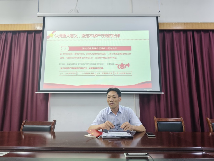 汪波以《严守党的纪律、加强党性修养——做一名好党员、好干部》为主题,从“认清重大意义,坚定不移严守党的纪律”“加强党性修养,切实掌握党的纪律内容”“坚持自省自励,自觉筑牢违规违纪底线”三个方面以及党的六大纪律内容开展授课,紧密结合师生日常学习工作,采用典型案例带领大家学党纪、守法规、筑底线,强调共产党员要讲党性重品行,师生党员干部必须继承和发扬优良作风,不断增强抓好风气建设的自觉性,自觉用党的纪律约束言行,切实对党的事业负责,始终保持党员干部的政治本色。