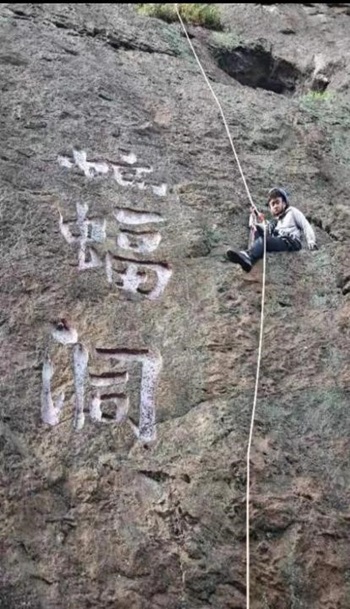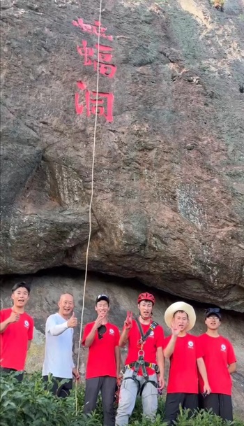 首先,两支实践团队驱车1个多小时来到中国工农红军第二十五军发源地麻埠镇,在镇政府同镇领导进行深度交流,详细了解镇村相关情况后,又驱车2个多小时的蜿蜒山路到达中国十大名茶之六安瓜片核心产区齐山村,帮助村里描红“蝙蝠洞”标志,由于字体在15-18米高的悬崖上,年久失修,字迹模糊,村里又缺乏专业人才,因此,实践团队充分发挥休闲体育专业优势,主动承担本次任务。下午13点30分,实践团队每人身背20公斤装备和给养,顶着夏季的烈日,徒步登山约3公里,累计爬升高度约500米,耗时约1小时40分钟,到达齐云山蝙蝠洞,随即兵分两路,一路由向导和休闲体育专业教师党员带队,携带攀岩专用绳前往崖顶固定抛绳,另一路在蝙蝠洞崖下准备专业攀岩工具。最终师生党员克服炎热、崖高、选位等多重困难,经过近3小时的奋斗,顺利完成“蝙蝠洞”3个字的描红工作。