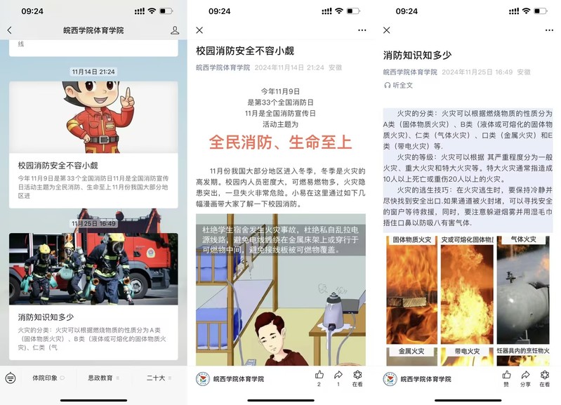 学院通过微信公众号和官方抖音号发布了一系列包含丰富图文的消防安全信息,内容涵盖火灾预防、火场逃生、灭火器材使用等实用知识,以图文并茂的方式吸引师生关注,深入人心地提升消防安全意识。