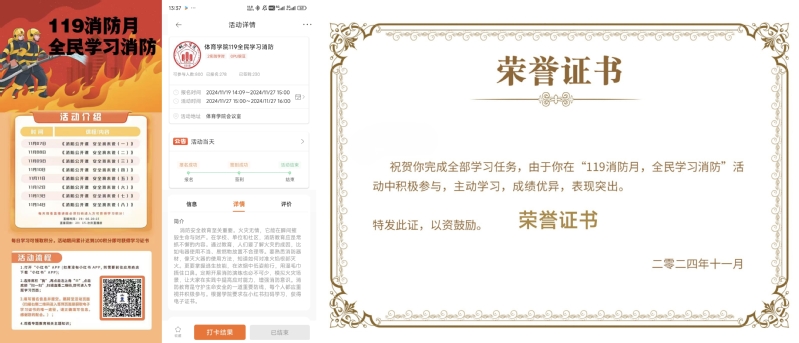 为了扩大消防安全知识的传播范围,学院积极运用线上平台,组织学生观看了“安徽消防”官方新媒体平台发布的“消防公开课安全我来说”系列科普视频。通过网络课堂的方式,将消防安全知识普及给每位学生,确保他们无论身处何地都能接受系统的消防教育。根据数据显示,学习证书的获取率超过80%,这反映了线上学习活动的高参与度和显著效果。