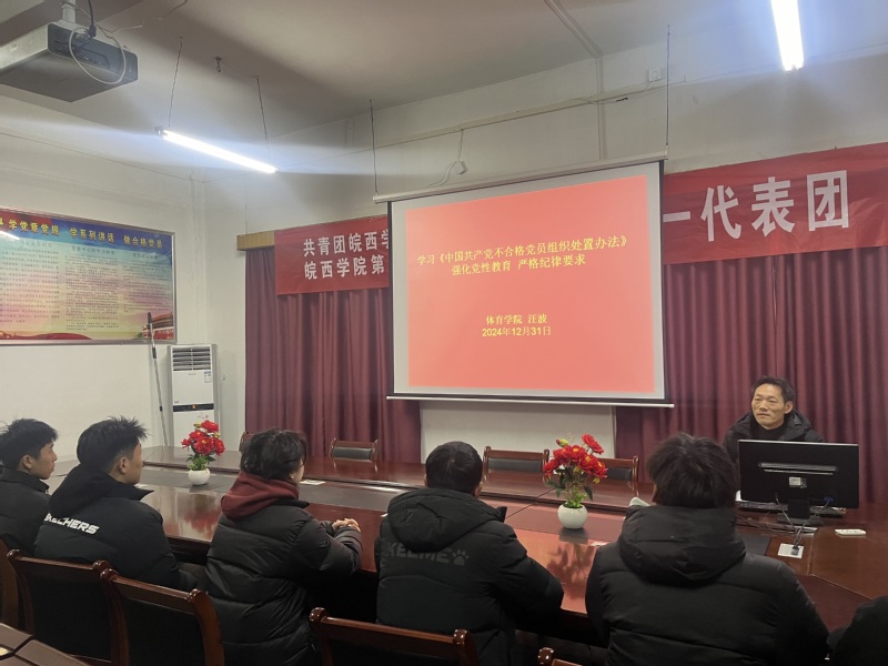 为深入学习贯彻党的二十大与二十届三中全会精神,加强党风廉政建设与师德师风建设,锤炼党员品质。12月31日下午,88038威尼斯检测中心党委副书记、院长汪波以学习《中国共产党不合格党员组织处置办法》为主题讲授了一场专题党课。体育教育专业教研室党支部与体育教育专业学生第一支部全体党员参加了党课学习。