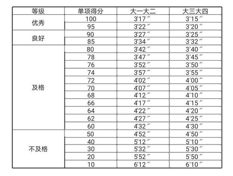 等级 | 单项得分 | 大一大二 | 大三大四 | 大一大二 | 大三大四 |