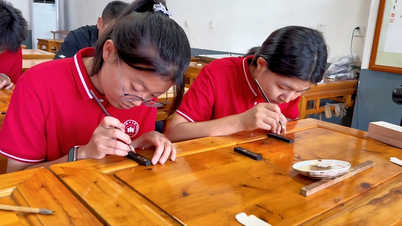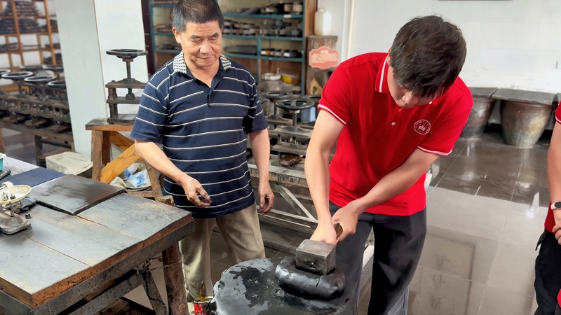 文化传承,薪火不息。实践首日(7月9日),团队便走进承载徽州艺术瑰宝的绩溪三雕博物馆,系统研习徽派砖雕、木雕、石雕的艺术精髓与历史流变,感受其巧夺天工的技艺与深厚的文化内涵。随后,实践团深入中国徽墨文化园(胡开文墨厂),在制墨师傅的悉心指导下,队员们完整参与了从松烟甄选、古法锤打炼墨到描金定版的徽墨制作全流程。亲身经历“千锤百炼出精品”的艰辛与执着,队员们零距离触摸到匠人精神的灵魂,对国家级非物质文化遗产“徽墨制作技艺”的活态传承现状有了深切体认,更深刻理解了保护与传承中华优秀传统文化的时代使命与青年责任。锤墨声声,敲击出的不仅是墨锭的成型,更是青年学子守护文化根脉的拳拳之心。