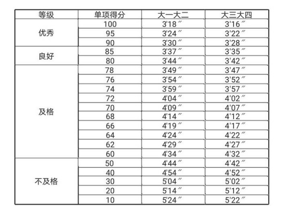 1.考试内容:(1)男子1000m、女子800m(评分标准详见表1、表2)。