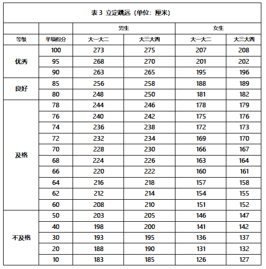 (2)男子、女子立定跳远(评分标准详见表3)。