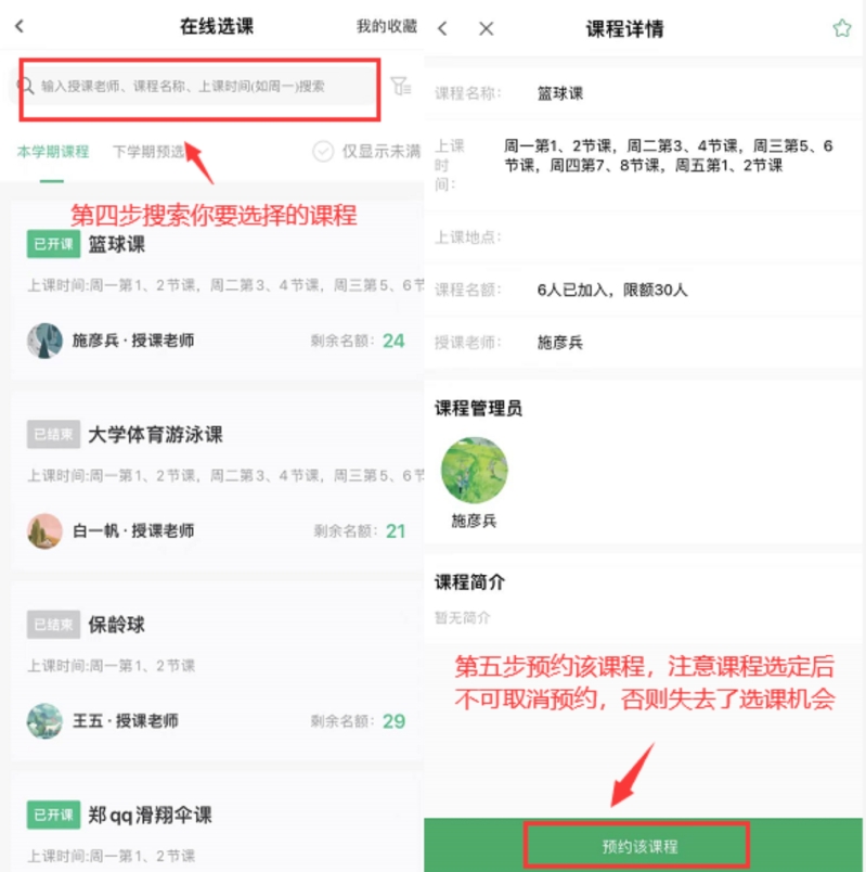 在发现页--点击【校园】--【我的课程】--【去选课】--点击【搜索】,搜索出符合自己的课程,点击该体育课,点击【预约该课程】完成“公共体育课”选课。恭喜您:选课完成。