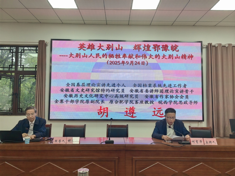 报告中,胡遵远系统梳理了鄂豫皖革命根据地光辉而艰苦的斗争历程,深刻阐释了大别山精神的历史渊源、丰富内涵与时代价值。他结合金寨县丰厚的红色资源,生动讲述了大别山地区军民为中国革命胜利所作出的巨大贡献与牺牲,并强调在新时代弘扬大别山精神,对凝聚奋进力量、推动高质量发展具有重要的现实意义。整场报告史料翔实、逻辑严密、情感真挚,引起师生强烈共鸣,现场掌声频频。